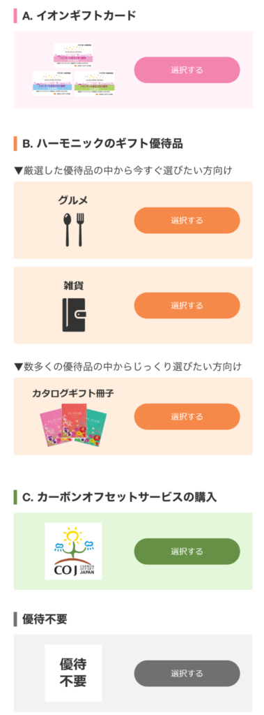 今回初めての優待ということもあり、カタログギフトかギフトカードで悩みました。