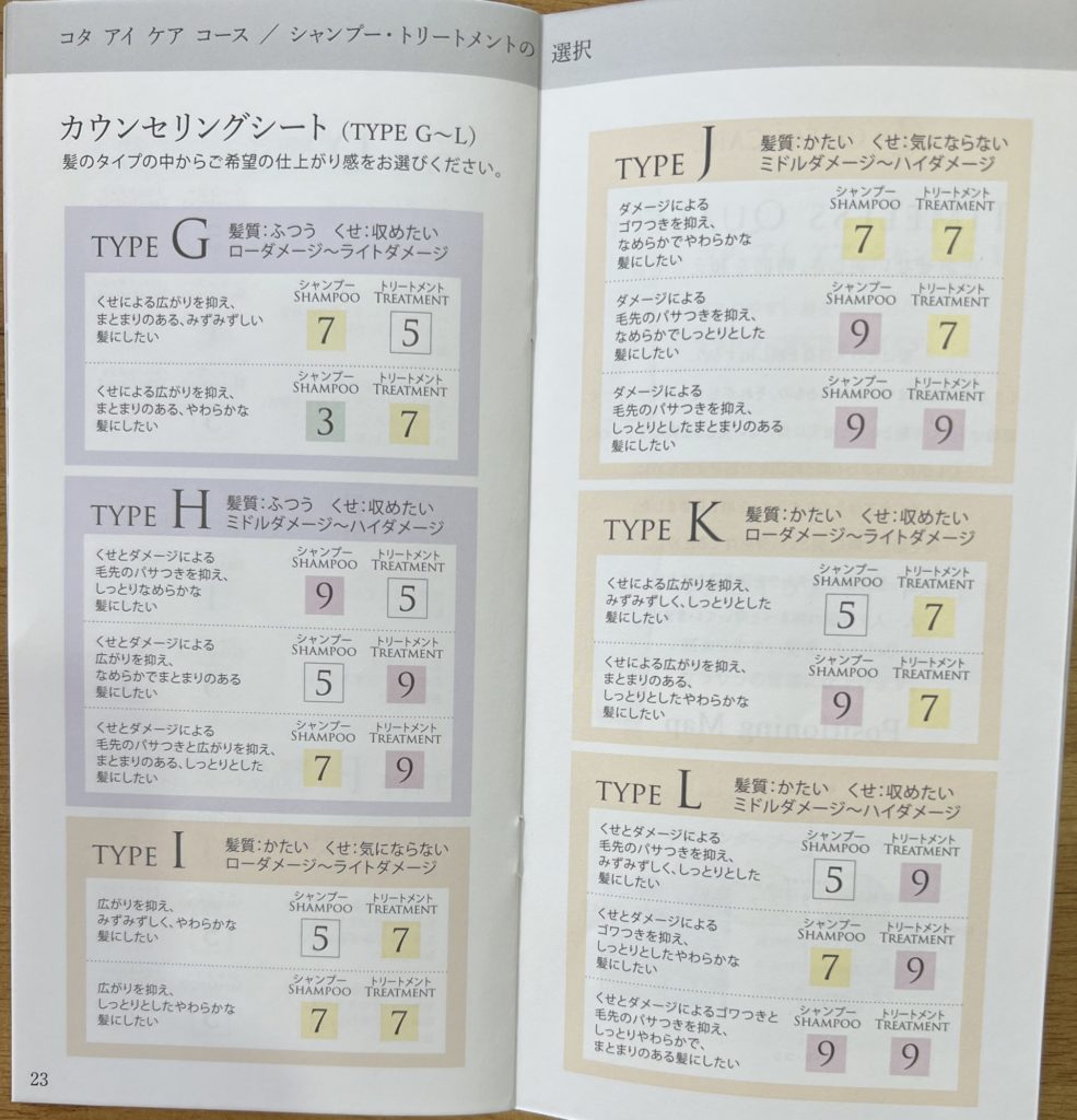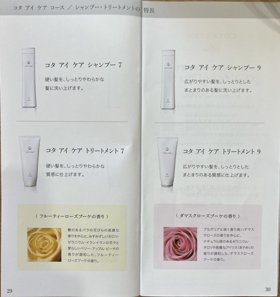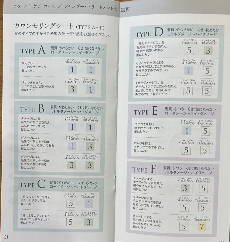 コタアイケアコースでは、カウンセリングチャートで自身の髪質に合ったシャンプー・トリートメントを選択することができますが、コタセラスパコースを選択した場合は、1種類のみとなります。