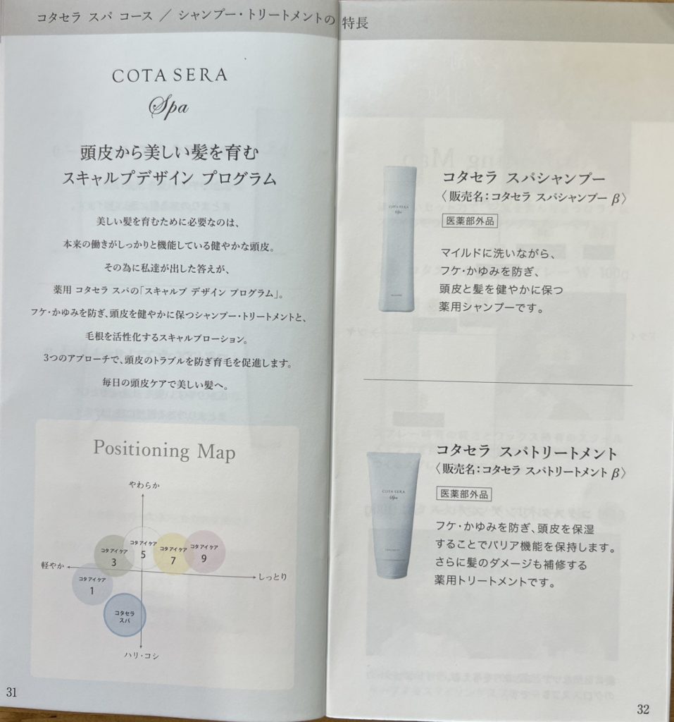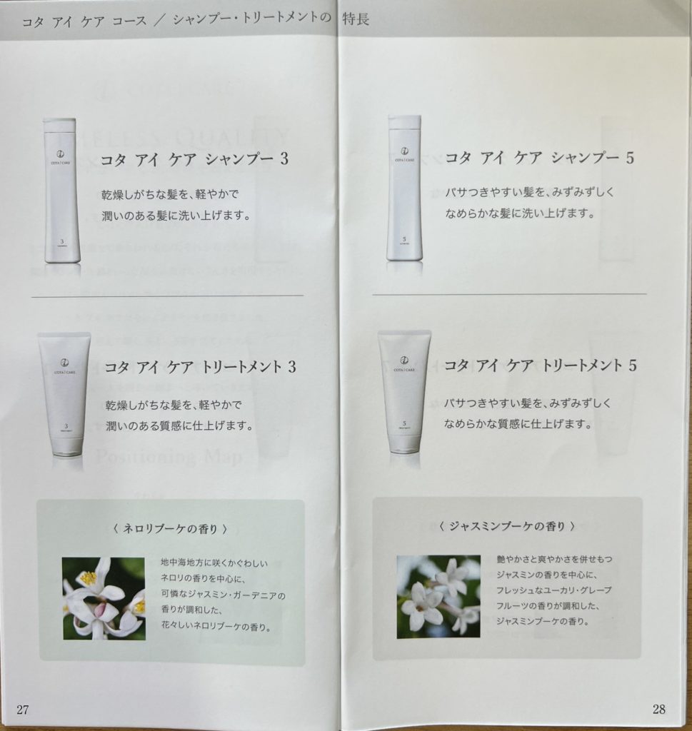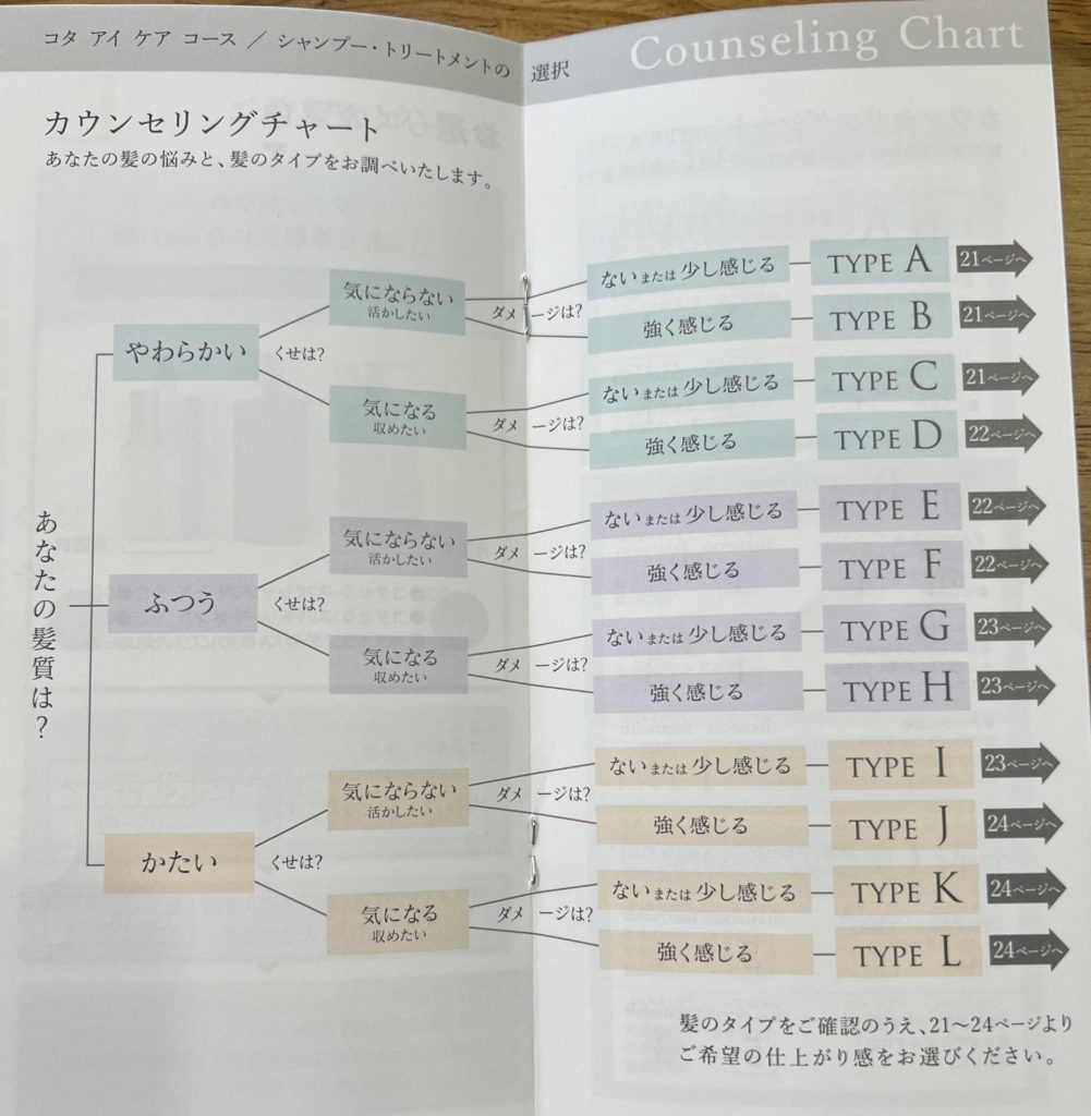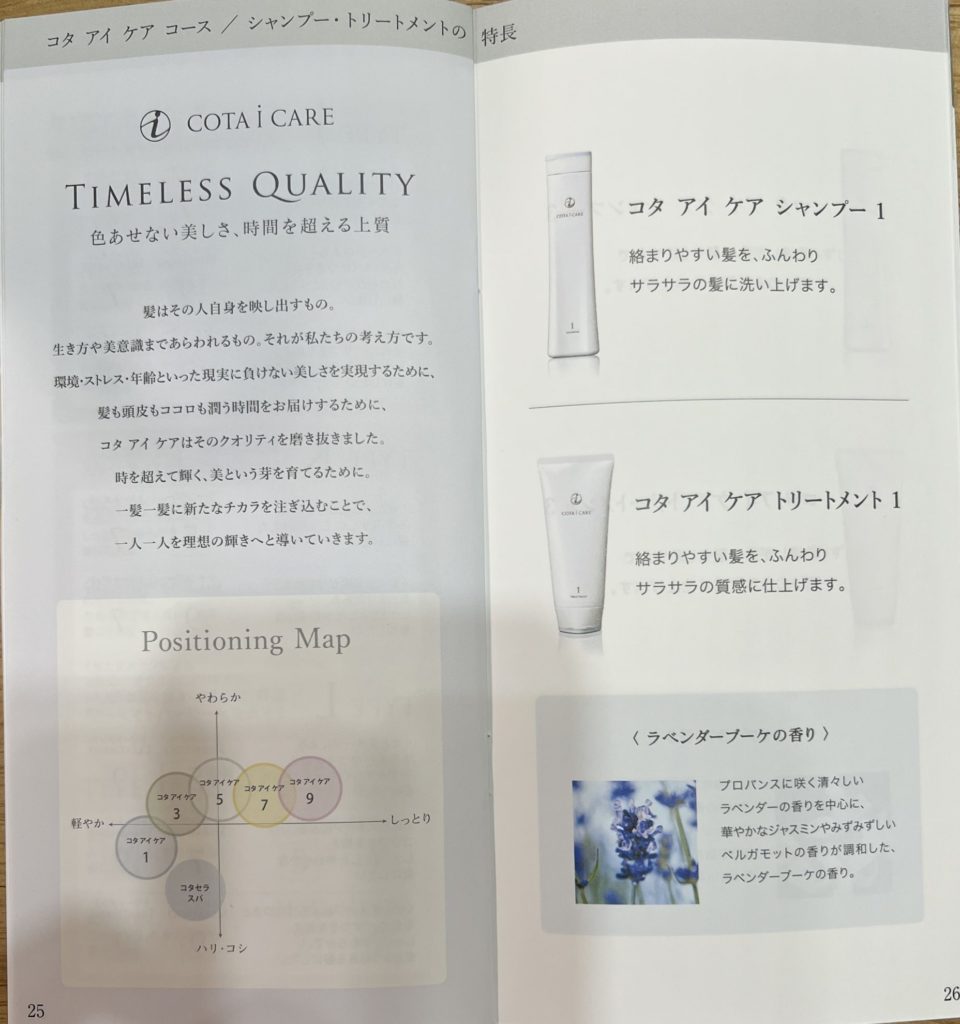 コタアイケアコースでは、カウンセリングチャートで自身の髪質に合ったシャンプー・トリートメントを選択することができますが、コタセラスパコースを選択した場合は、1種類のみとなります。