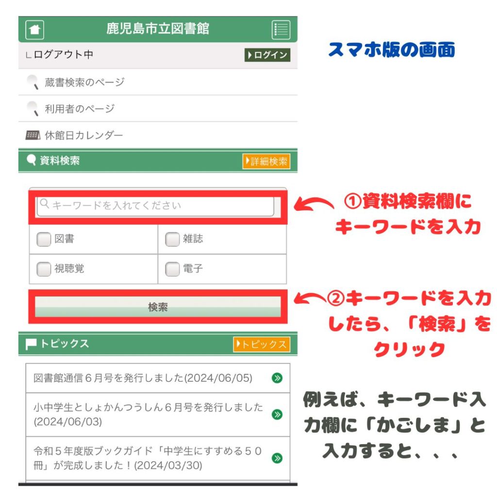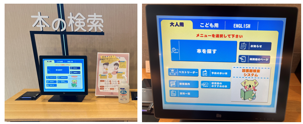 本の検索は図書館内にある検索機でもできるけど、ホームページから検索できるよ。