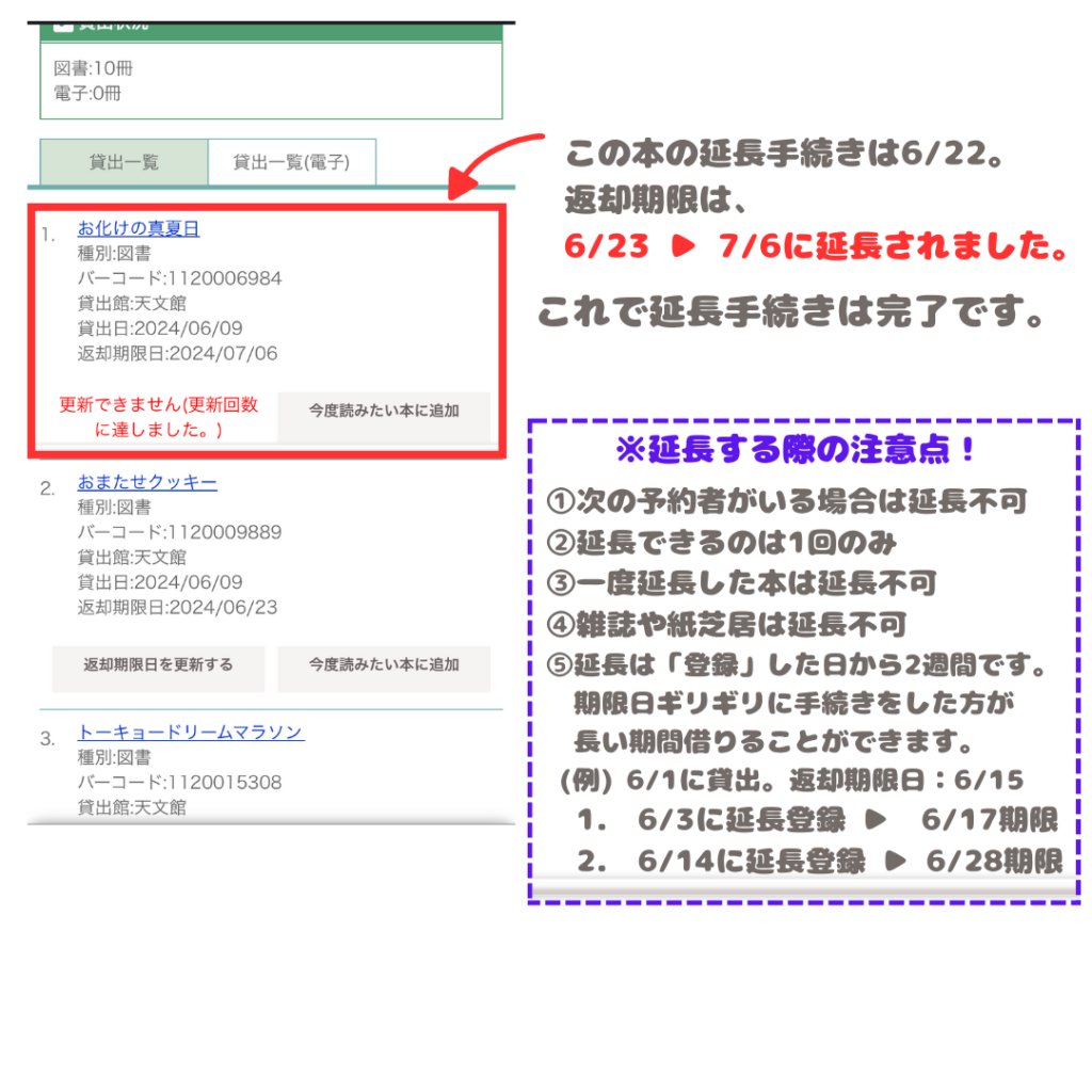 - 一度延長した本は延長不可